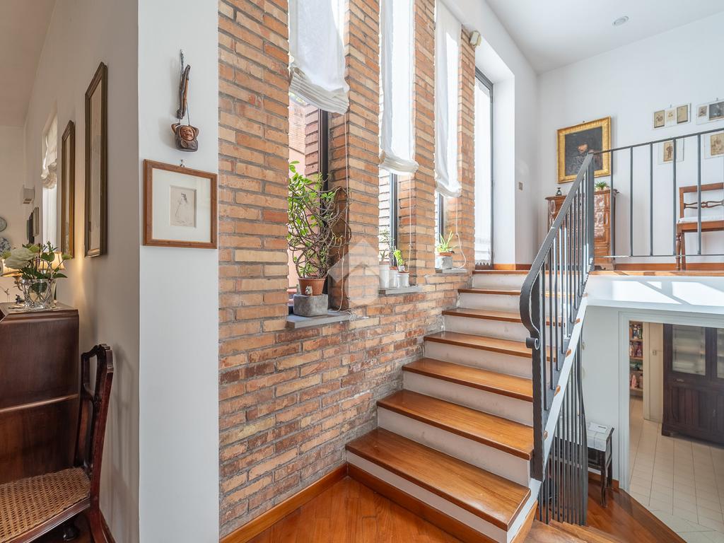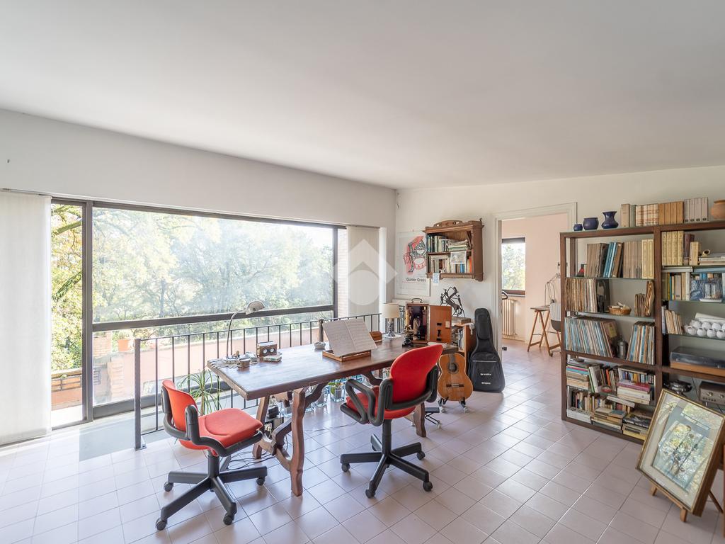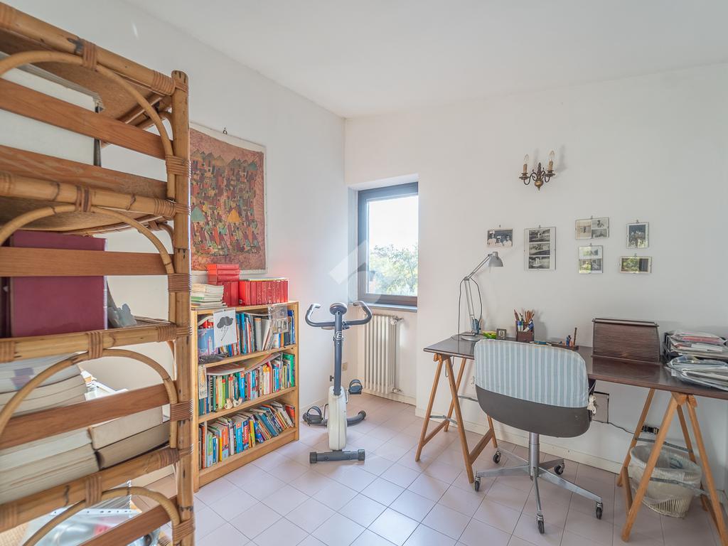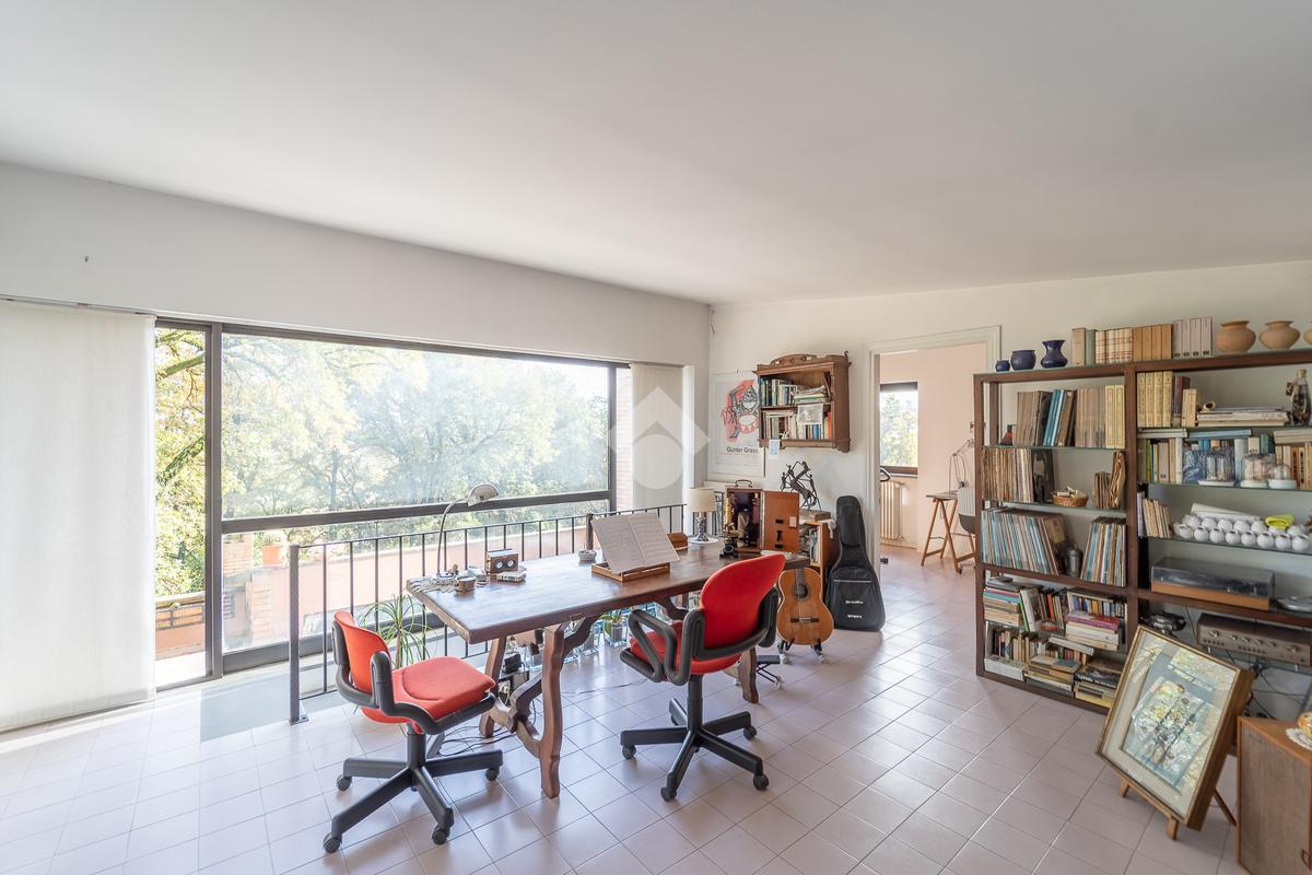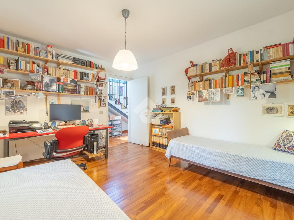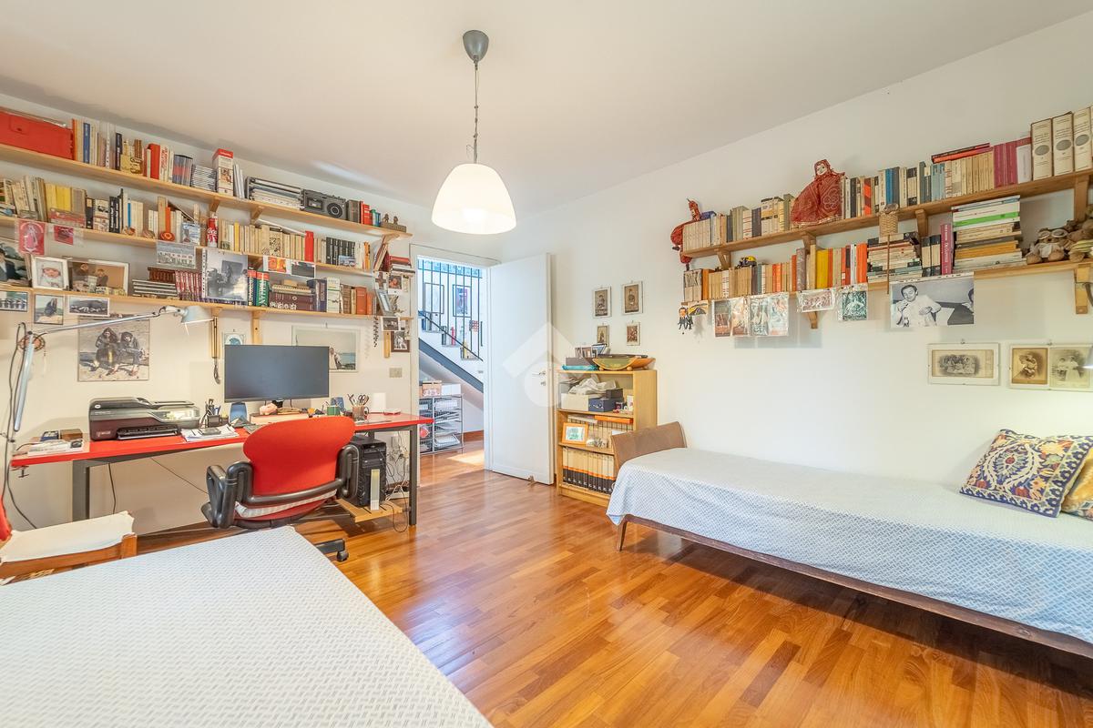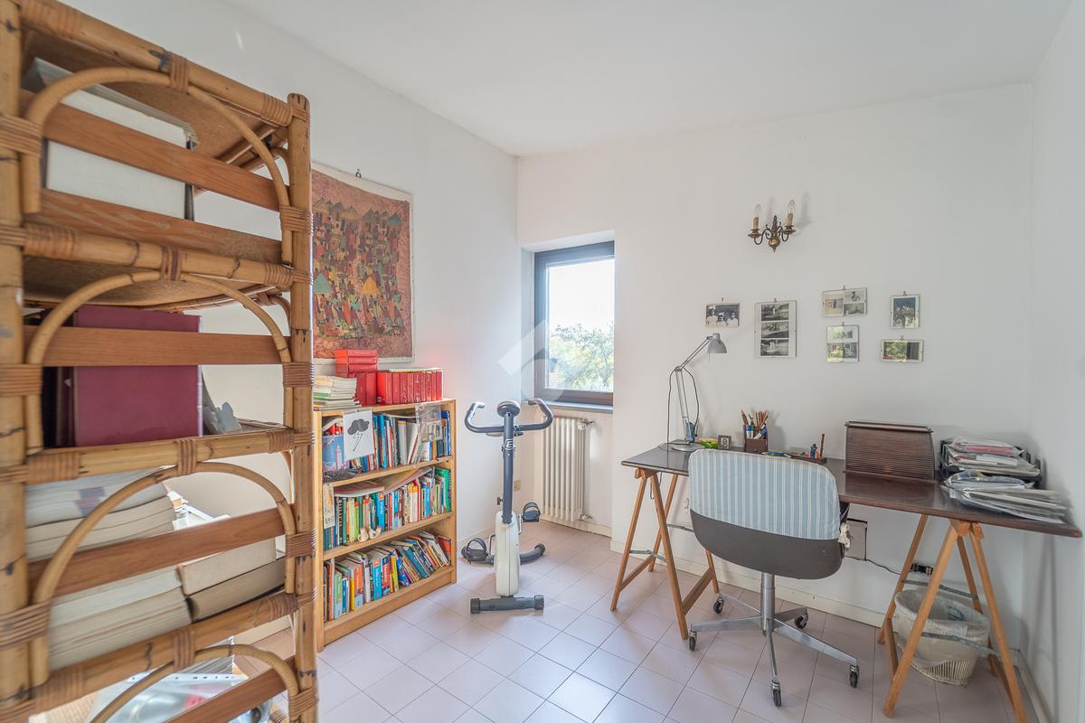 Il livello superiore ospita un luminoso piano composto da un grande studio, una cameretta e un bagno finestrato. Tutti gli ambienti hanno accesso a un suggestivo terrazzo di 35 mq con vista aperta sul verde. Non si tratta di una mansarda, bensì del primo e ultimo piano dell’abitazione.