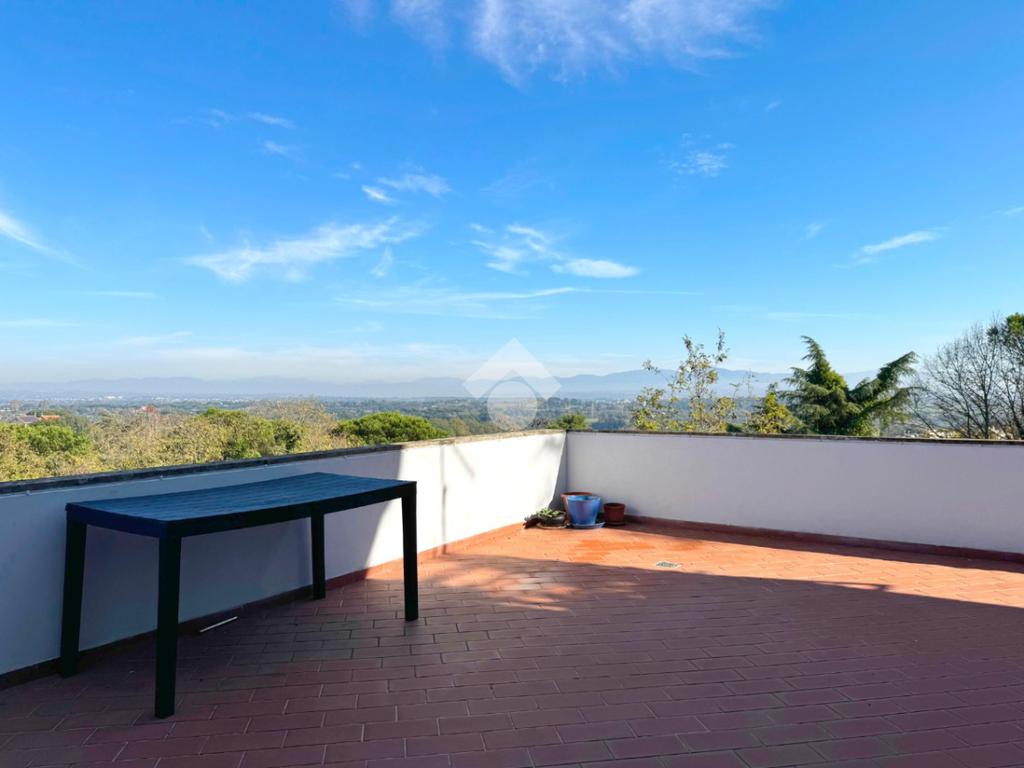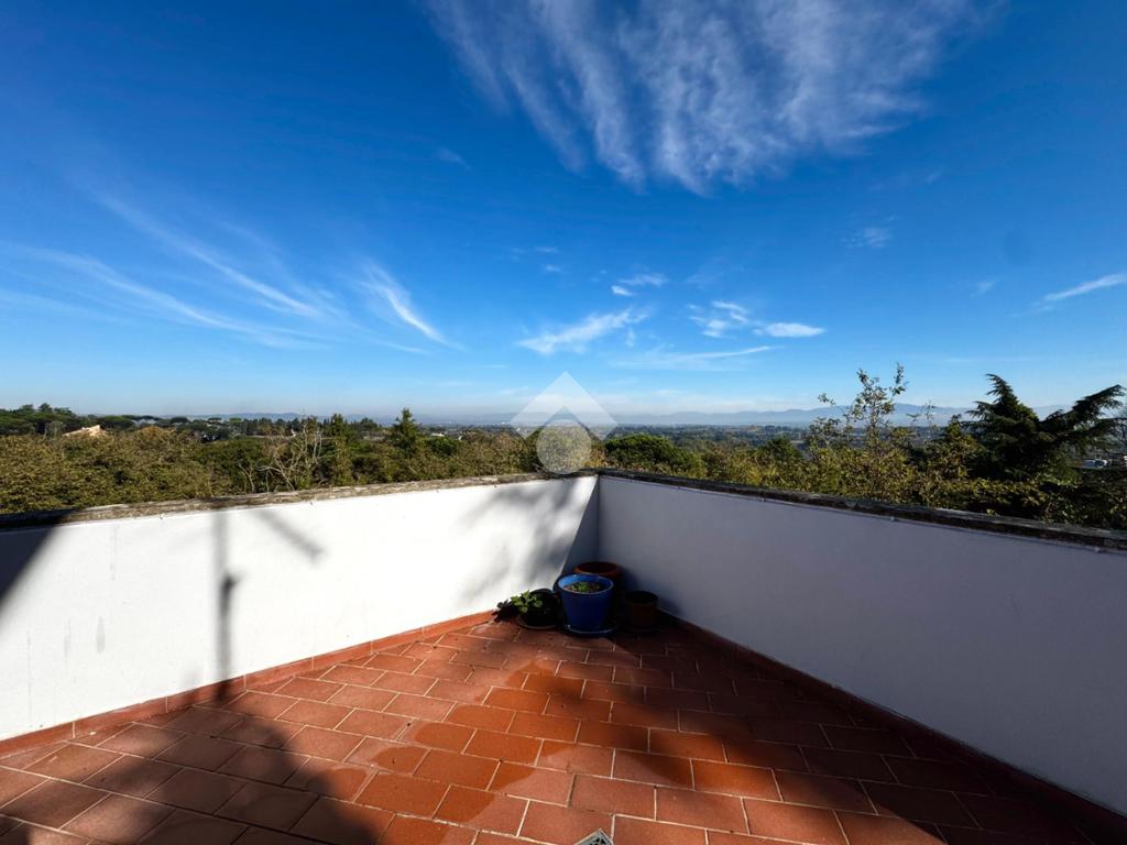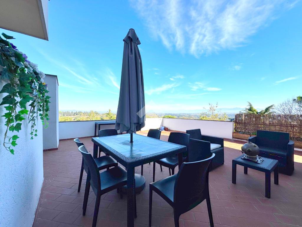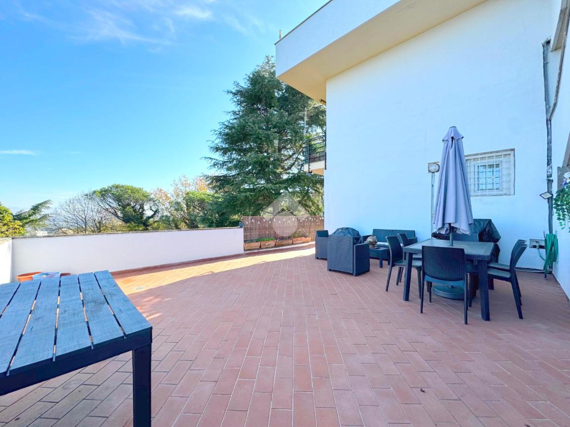 Appena si entra in casa si scendono pochi gradini e si accede al soggiorno luminoso, con uscita diretta su un grande terrazzo panoramico di circa 80 mq, vero punto di forza dell’abitazione: uno spazio esterno riservato, con vista aperta e luminosa, ideale per rilassarsi o ricevere amici.