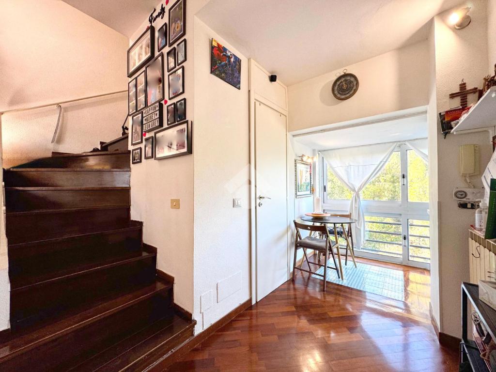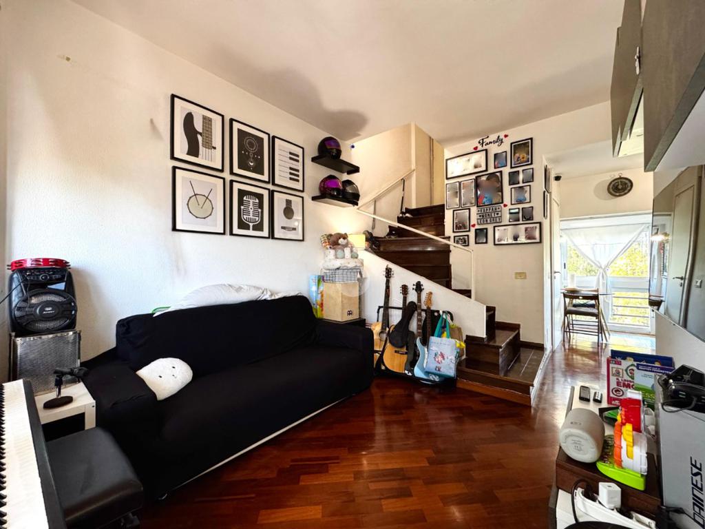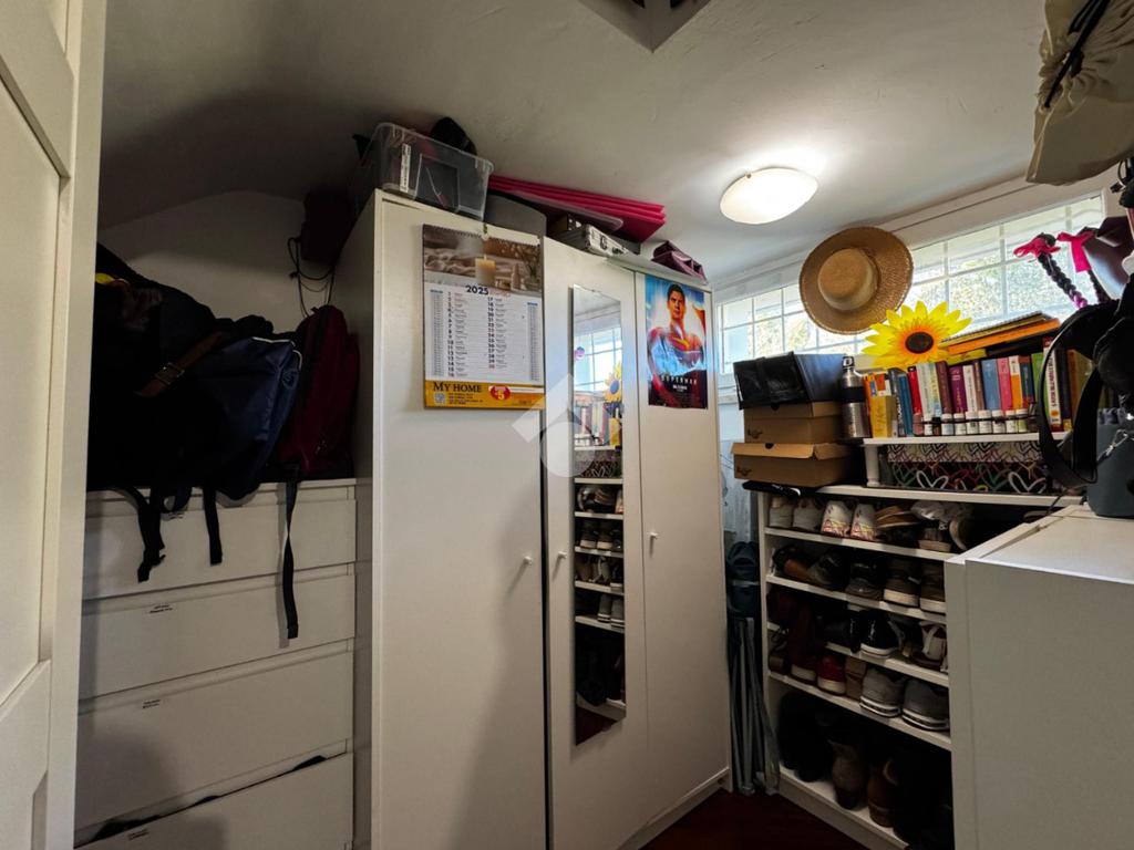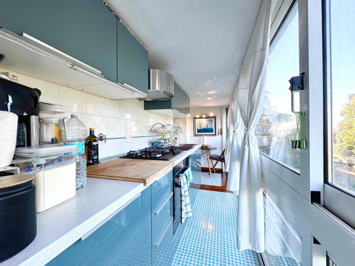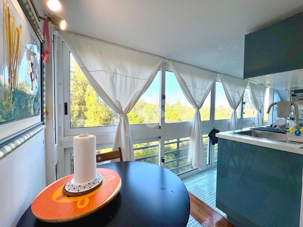 La cucina, chiusa da ampie vetrate, è una ex veranda condonata molto luminosa. La camera matrimoniale dispone di un armadio a muro, mentre la piccola cameretta/studio è dotata di soppalco utilizzabile come ripostiglio. Soggiorno e camera affacciano entrambi sul terrazzo.